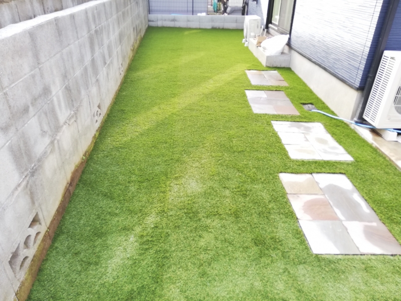 今回ご依頼いただいたお客様はお庭を綺麗にしたいだけでなく、他の家にはないオシャレさがご要望でした。 お客様は弊社のホームページの人工芝オプションを見て、踏み石のご相談もされたのでした。 踏み石工事やレンガ工事・野外ライト工事いずれも、お庭に人工芝を工事する前に設置した方が良い外構です。 今回はお客様チョイスの踏み石を工事し、人工芝施工をしました。 人工芝専門業者でも人工芝をより活かすためのちょっとした外構はいくつもご提案できます!