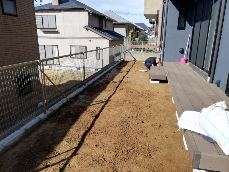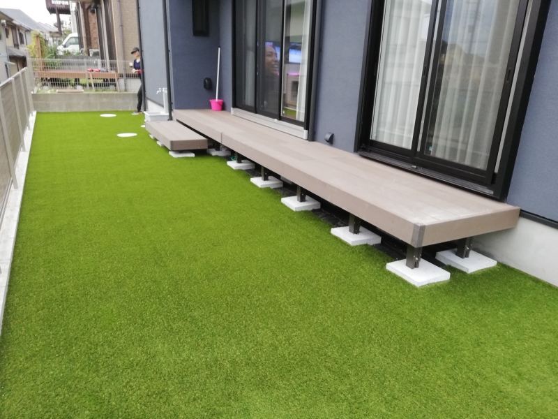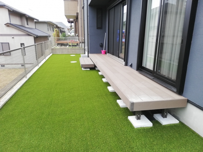 ウッドデッキは千葉県の別の業者様が工事し、その下に綺麗に人工芝を入れ込むことで見違える景観となりました。