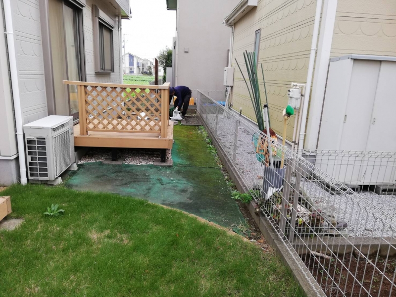 お客様は10年前に雑草対策として人工芝マットを工事業者に設置してもらってからずっと、