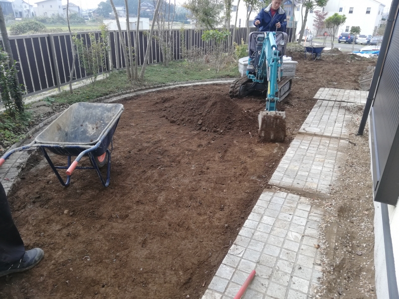 まずは天然芝をユンボで剥がして、掘削から行います。