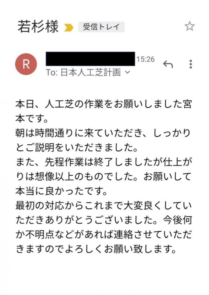 人工芝工事の後、お客様がわざわざ感動のメールくださったこと、非常に嬉しいです。