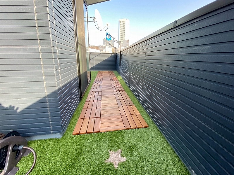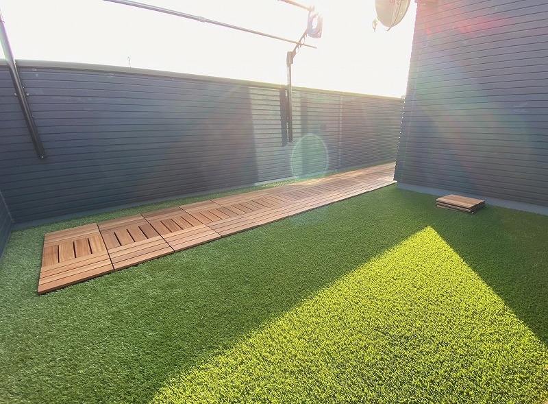 一部をウッドパネルにし、それ以外の部分を人工芝工事ご希望のお客様でした。 木と人工芝は組み合わせが良いです。 また、ワンポイントカラー人工芝キャンペーンの星型も入れておしゃれ度がアップしました。 家から気軽に出て遊べる空間になりました。