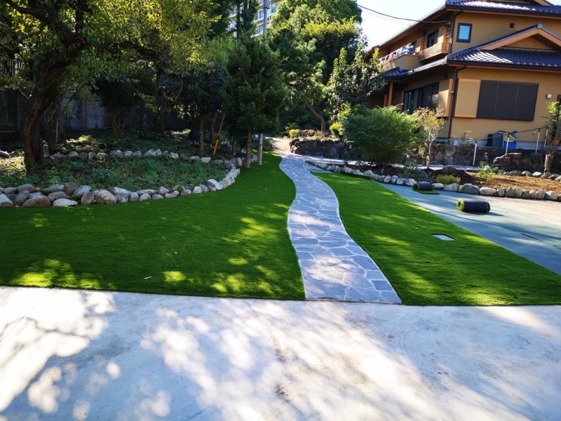 今回は5日間の工事でした。 曲線のカットや木の周りのカットも綺麗に完成しました。 面積が広い場合にも、地道に作業を重ねていくという工程は一緒です。 今回のお庭は300平米近くの広さでしたので、迫力満点の人工芝生のお庭になりました。