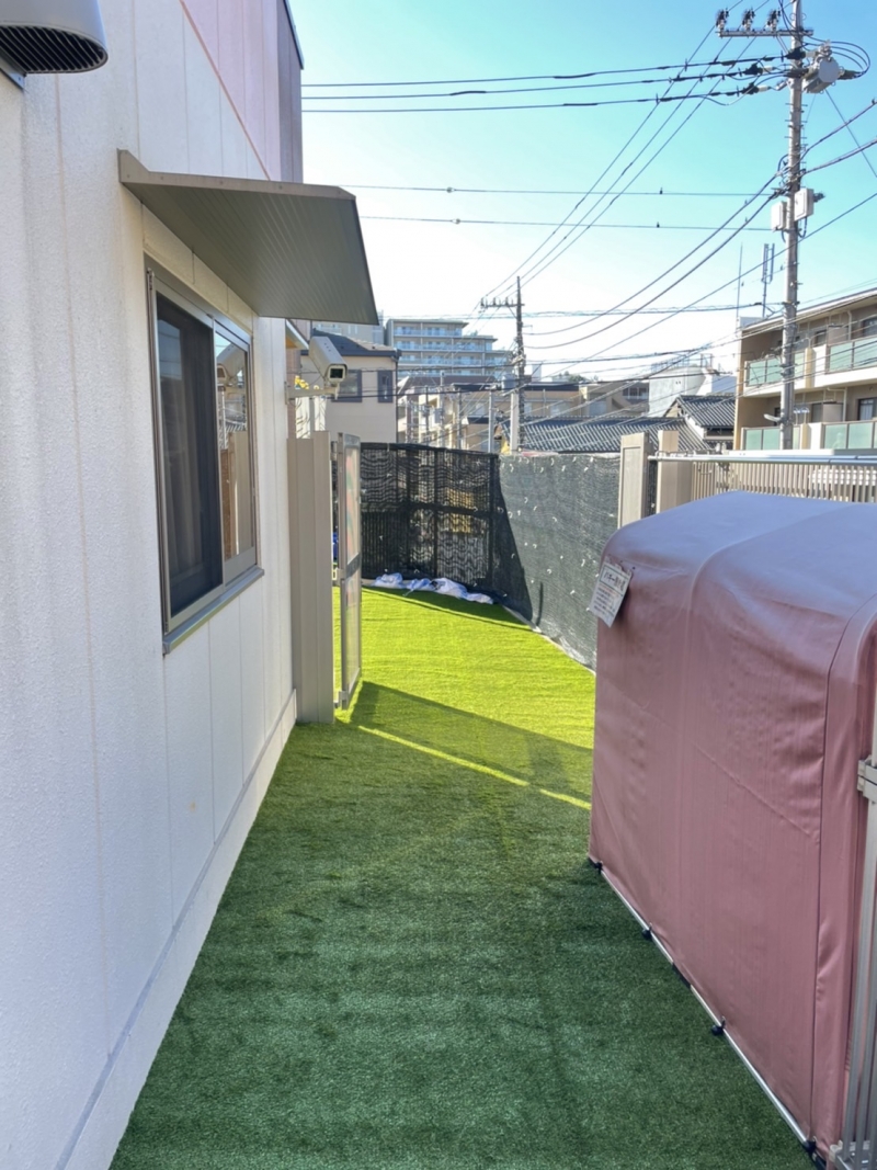 200平米程度ある広い園庭が、人工芝で景観も良く、踏み心地も良くリニューアルしました。