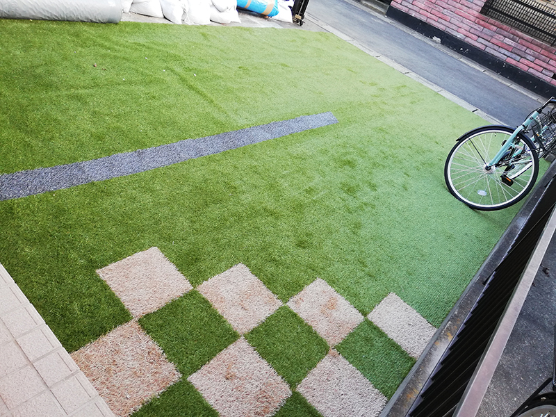 ワンポイントでカラー人工芝を導入することで、「DIYのなんちゃって人工芝」でなく
